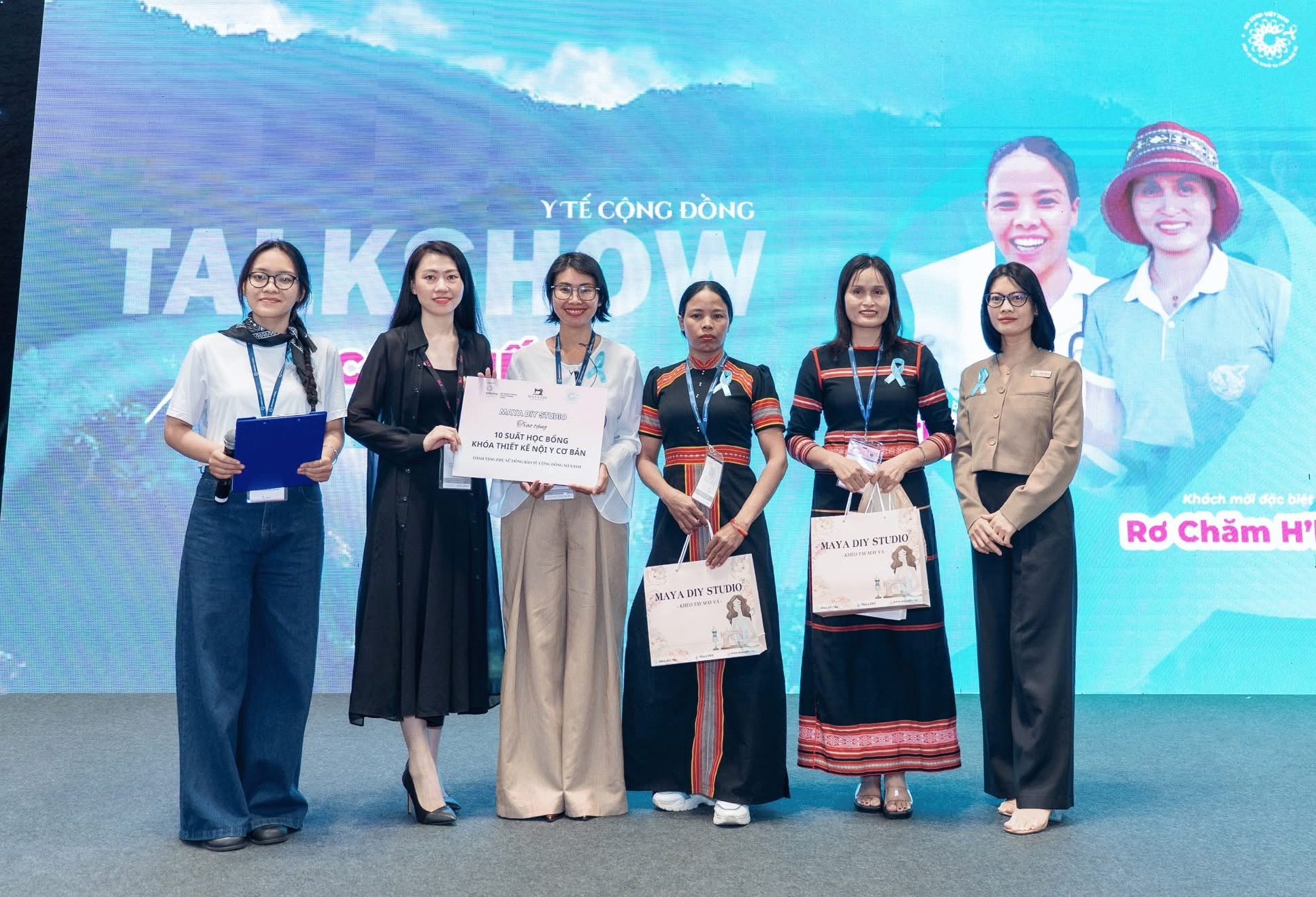 Chị Rơ Châm H’Ken (ở giữa) và Hồ Thị Hiếu (bên phải) là đại diện phụ nữ đồng bào nhận học bổng của MAYA DIY Studio tại SIUF Việt Nam 2025