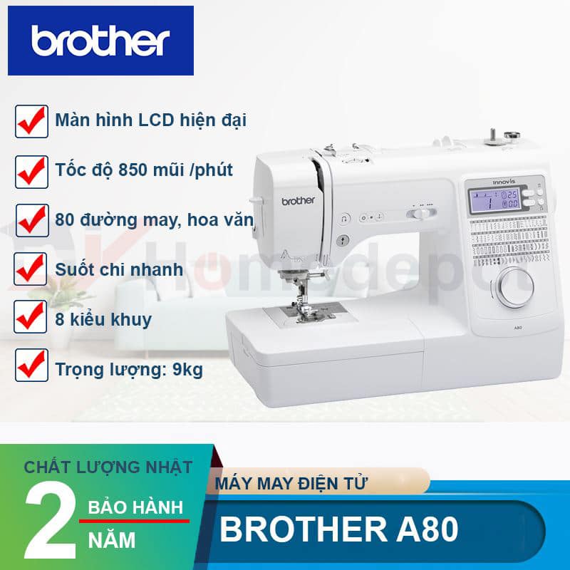 Máy may gia đình Brother A80 có đến 80 đường may cơ bản và hoa văn trang trí, 8 kiểu khuy áo trong một bước tự động sự lựa chọn hàng đầu của các bạn nữ công gia chánh. Các bạn có thể tham khảo chi tiết về máy may Brother A80 ở đường link dưới đây: